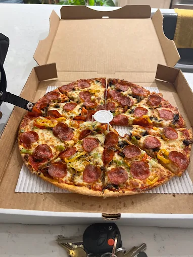 Pizza Sauce, Ham, Salami, Pepperoni, Onion, Green pepper, Mushrooms & mozzarella cheese